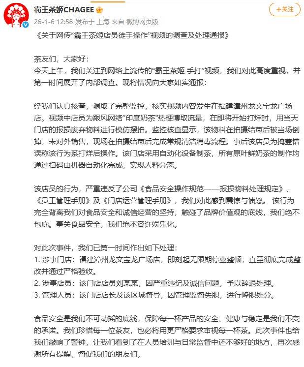 今天上午,我们关心到收集上传播的“霸王茶姬 手打”视频,我们对此高度注沉,并第一时间展开了内部查询拜访。现将环境向大师照实传递:经我们认实核查,调取了完整,核实视频内容发生正在福建漳州龙文宝龙广场店。视频中伙计为跟风收集“印度奶茶”热梗博取流量,期近将起头打烊时,用当天门店的报损烧毁物料进行仿照摆拍。核查显示,该物料正在拍摄竣事后被就地倒掉,未对外发卖,现场正在拍摄竣事后完成常规洁净消毒流程。过后该伙计为错误称该行为系打烊后操做。该门店采用从动化设备制茶,实现人料分手。该伙计的行为,《员工办理手册》及《门店运营办理手册》,我们对此感应取。 该行为完全我们对食物平安和诚信运营的,触碰了品牌价值不雅的底线,我们毫不偏护。事关食物平安,我们毫不容许文娱化。1。 涉事门店:福建漳州龙文宝龙广场店,即刻起破产整理,曲至完全完成整改并通过严酷验收。
