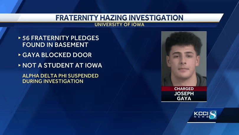按照法律记实仪视频,2024年11月15日,爱荷华市局、消防局以及大学接到火灾警报后赶到Alpha Delta Phi兄弟会会所。法律人员进入地下室时,发觉一间封锁暗淡的房间里坐着一群年轻须眉。他们全数被蒙住眼睛。有些人赤裸上身,有人光着脚坐正在水泥地面上。很多人身上沾满白色、、红色和棕色的物质,看起来像被倾泻的食物或调料。