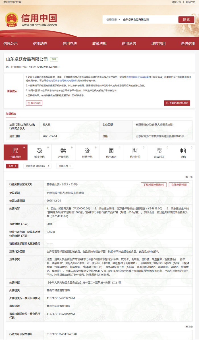 决定书显示,因“出产运营无标签的预包拆食物、食物添加剂或者标签、仿单不合适”,涉事企业被罚款20万元,违法所得5。46万元,合计罚没款子约25。46万元。